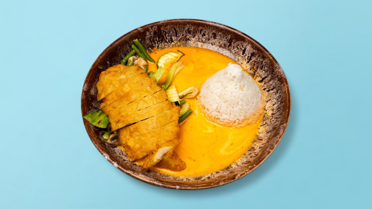 rotes Curry mit gebratenem saisonalem Gemüse, zartem Duftreis und einer Zutat deiner Wahl
