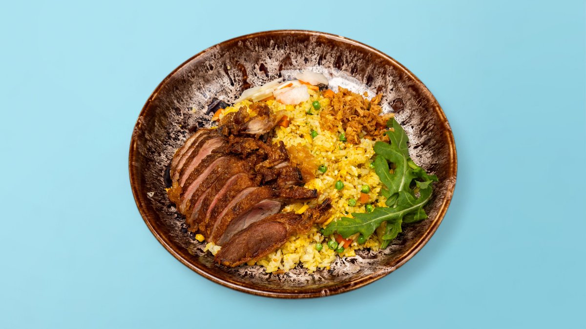 gebratener Eierreis mit Mais, Erbsen, Karotten, gerösteten Zwiebeln und einer Zutat deiner Wahl
