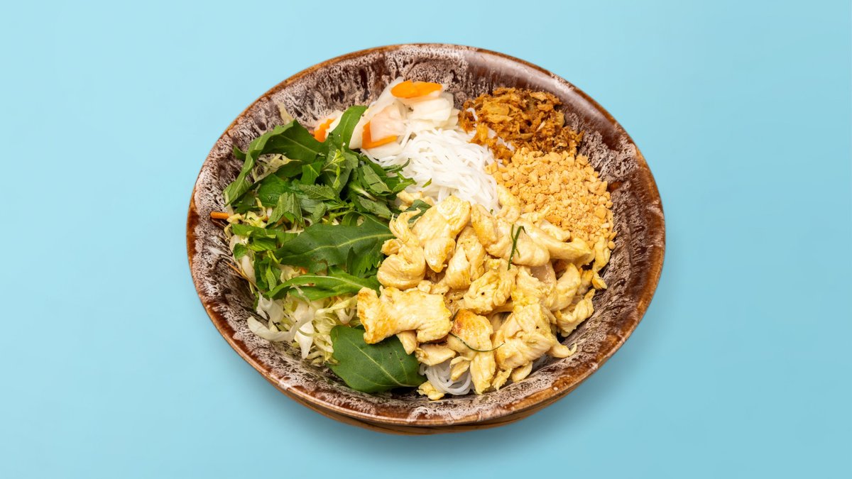 lauwarmes leichtes Reisnudelgericht mit frischem Salat, Koriander, Minze, gehackten Erdnüssen, gerösteten Zwiebeln, hausgemachtem Limetten-Dressing und einer Zutat deiner Wahl