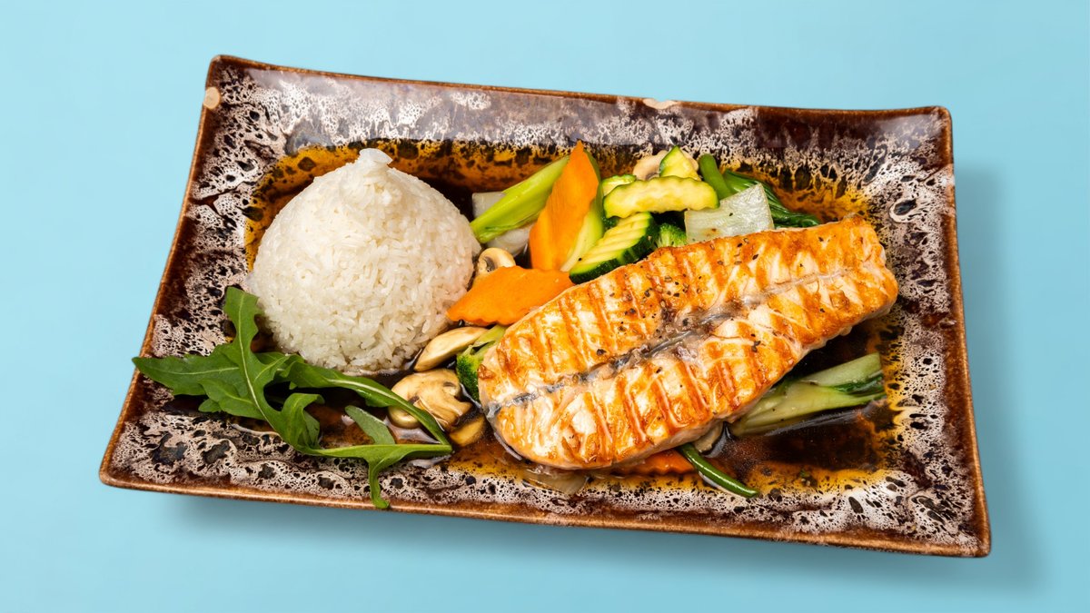 gegrillter Lachs mit saisonalem gebratenem Gemüse, würziger Soße und zartem Duftreis