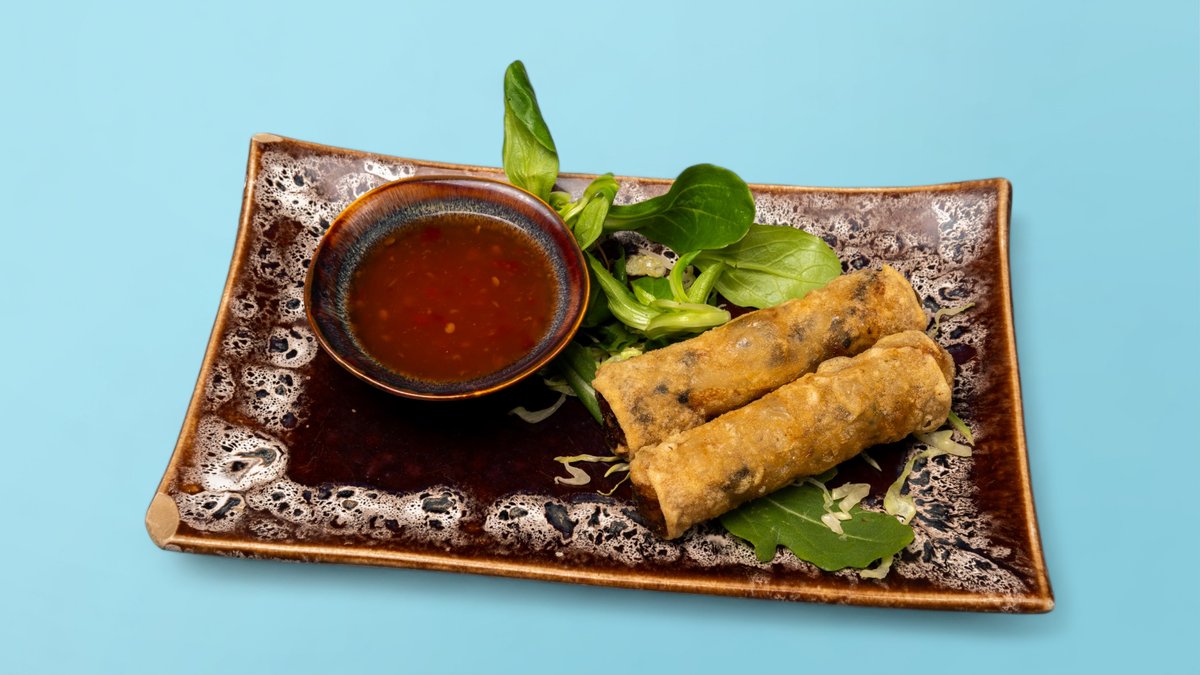 2 gebratene Frühlingsrollen gefüllt mit Hackfleisch, Glasnudeln, Morcheln, Kohlrabi, Karotten und hausgemachtem Limetten-Dip