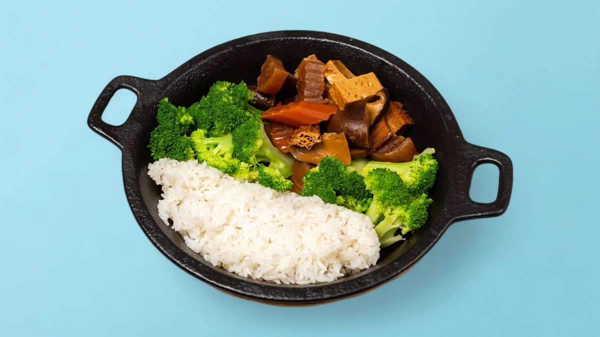 veganes Hähnchen in einem gusseisernen Topf gekocht mit Rettich, Karotten, Kräuterseitlingen, Kokosfleisch, Sojaschnetzel in einem würzigen Sud, Brokkoli und zartem Duftreis