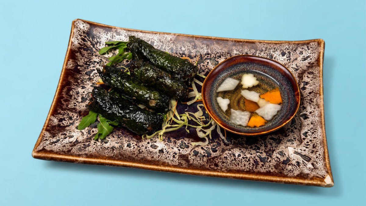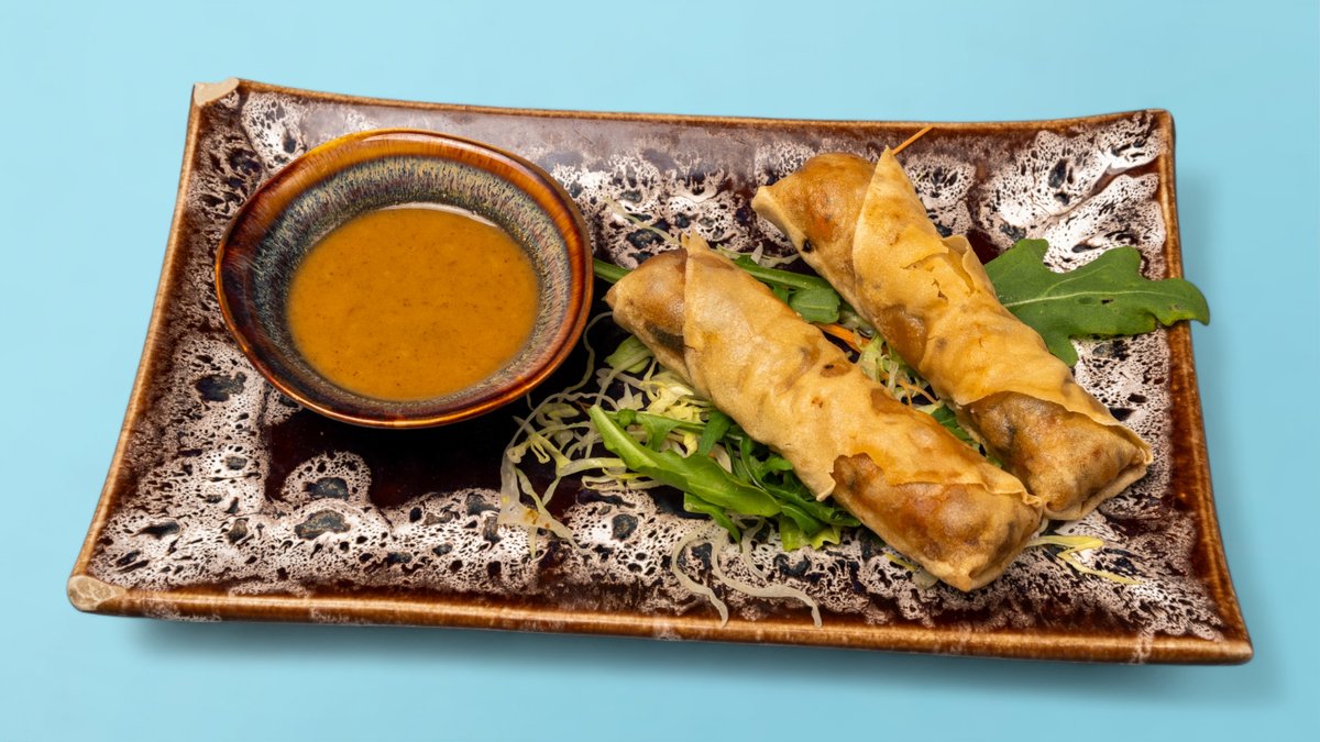 2 gebratene Frühlingsrollen gefüllt mit Glasnudeln Shiitake-Pilzen, Morcheln, Mungbohnen, Süßkartoffeln, Gemüse und cremigem Erdnuss-Dip