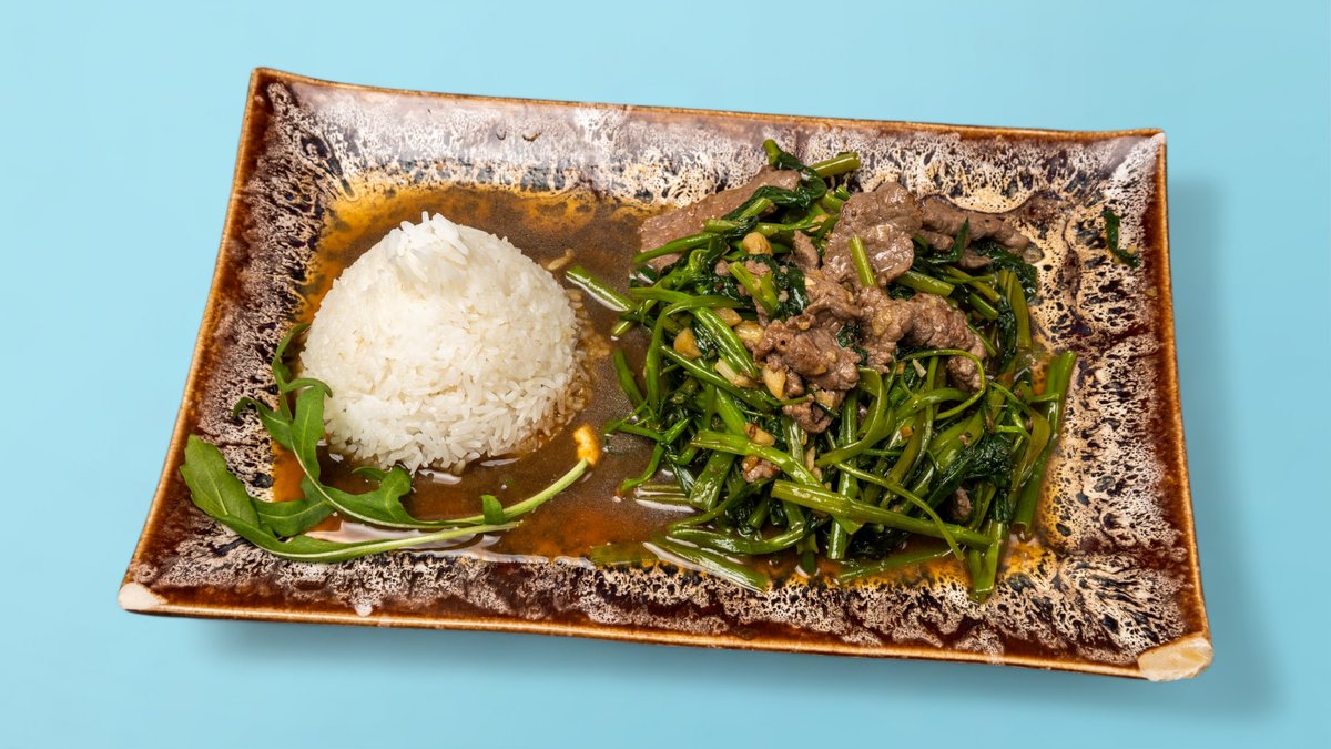 gebratener Wasserspinat in Knoblauch gebratenem Rindfleisch und zartem Duftreis