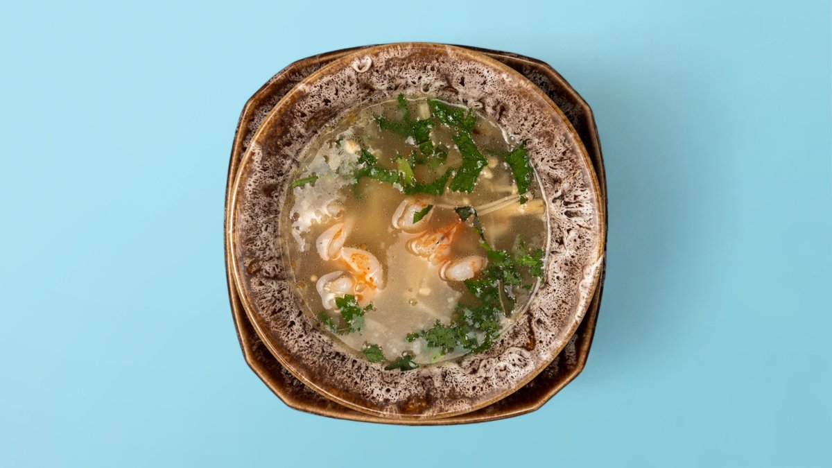 würzige Garnelensuppe mit Ingwer, Morcheln, Pilzen und asiatischen Kräutern