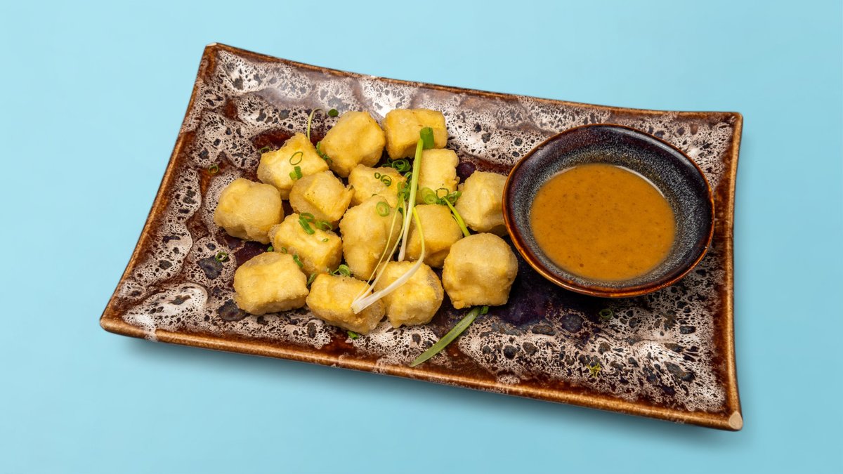 knusprig gebackener Tofu mit einem cremigen Erdnuss-Dip