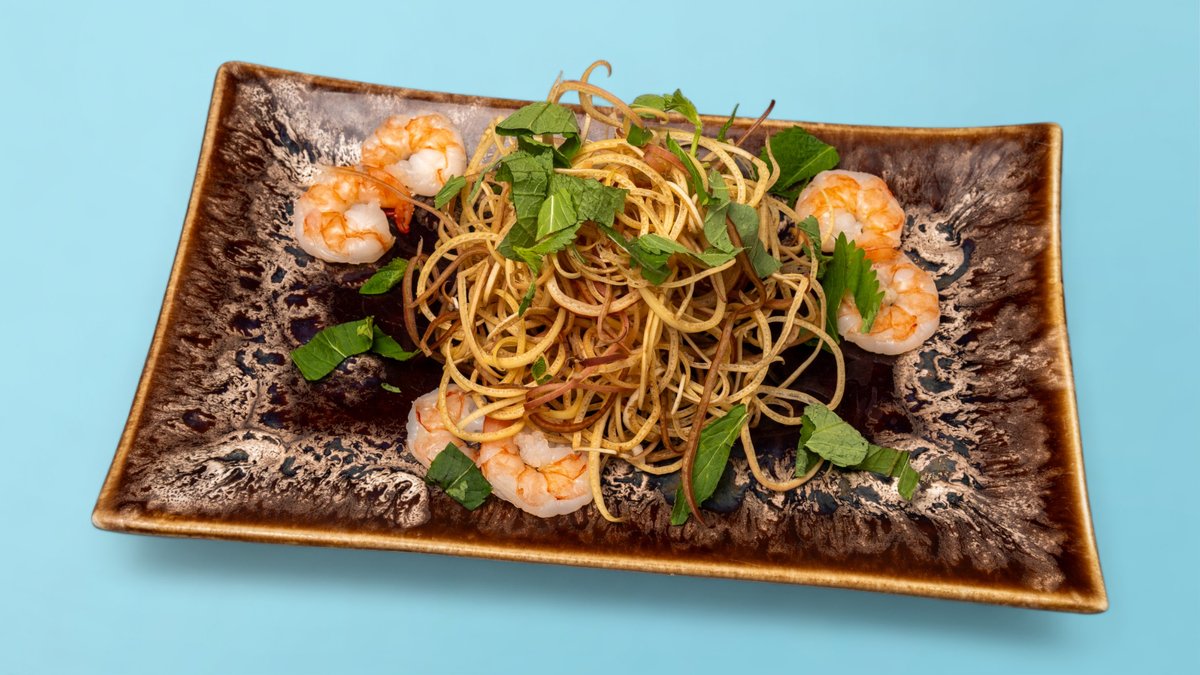 vietnamesischer Papaya-Salat mit Karotten, frischer Minze, asiatischen Kräutern, Sesam, gehackten Erdnüssen, traditionellem Dressing und einer Zutat deiner Wahl