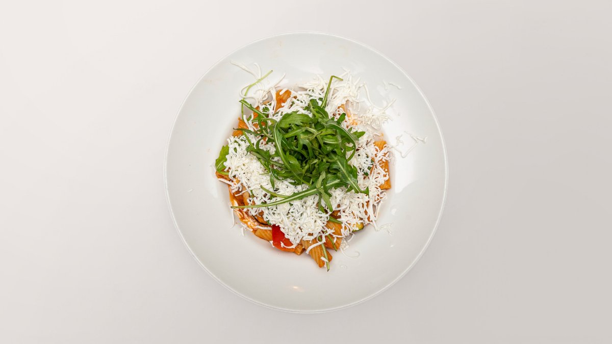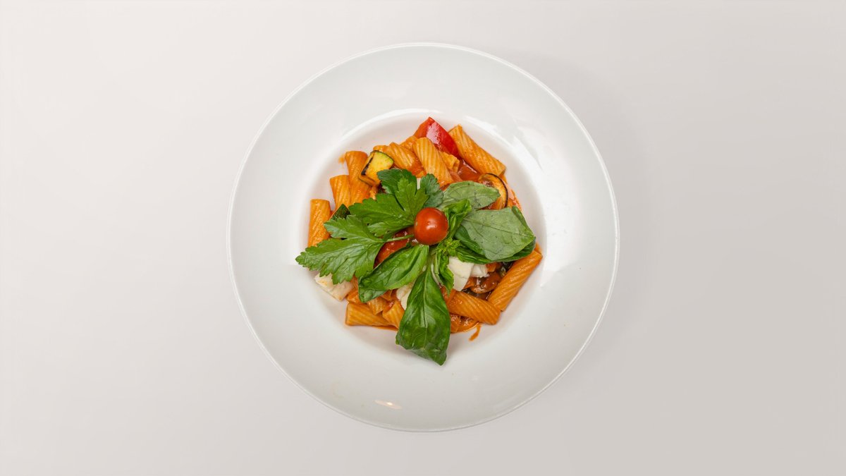 short pasta with zucchini, peppers, mozzarella pieces and fresh mushrooms in tomato sauce