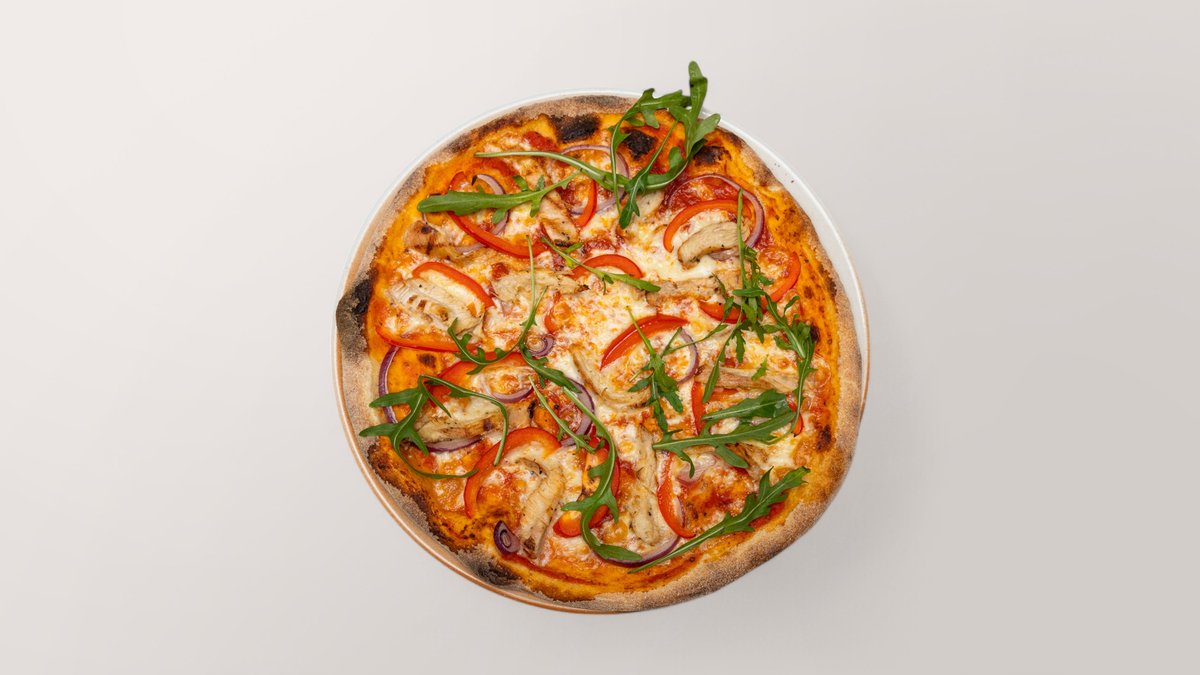 Salad variation with fried chicken breast strips, fresh mushrooms, peppers and onions on rocket salad, with shaved parmesan and tomatoes in mustard-lemon vinaigrette