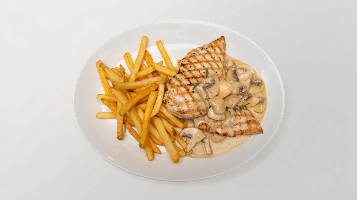 with fresh mushrooms in cream tomato sauce, served with French fries
