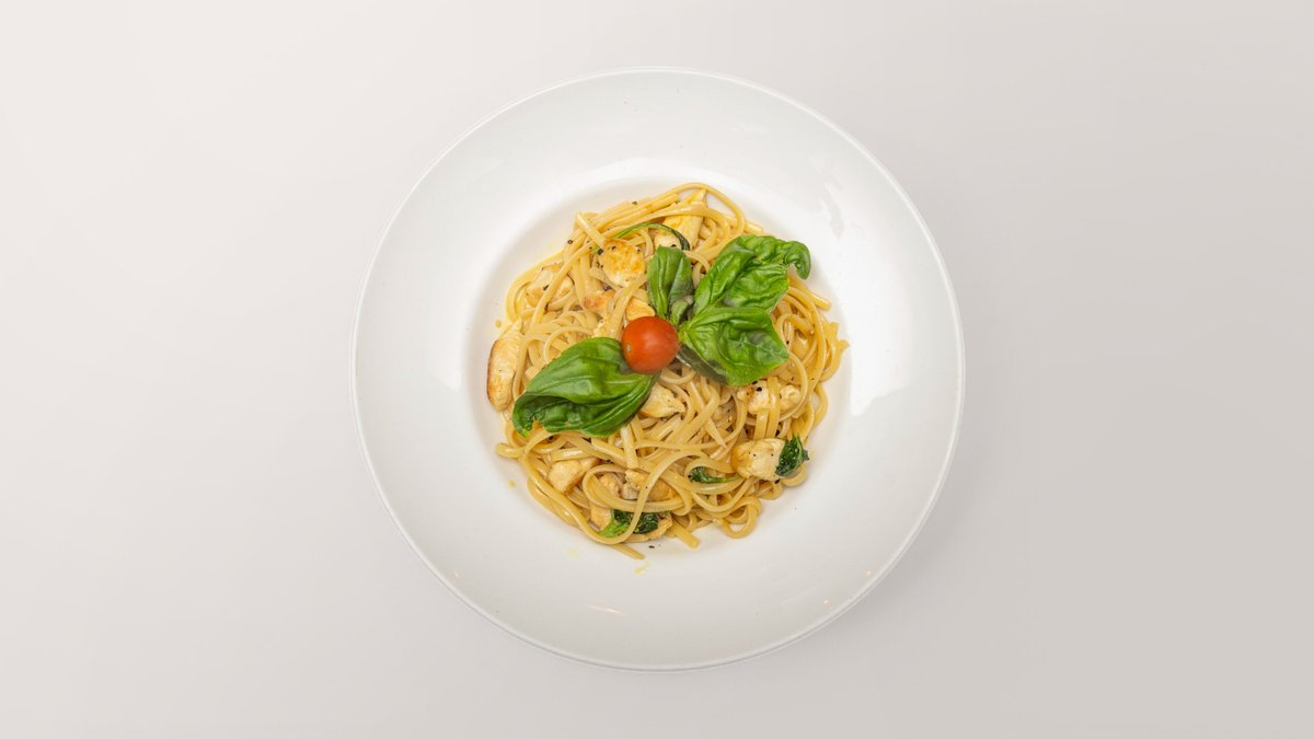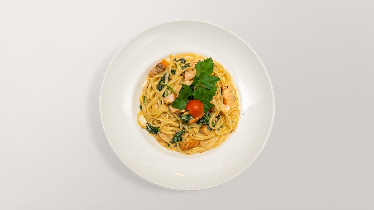 short pasta with chicken breast strips, fresh leaf spinach and onions in gorgonzola sauce