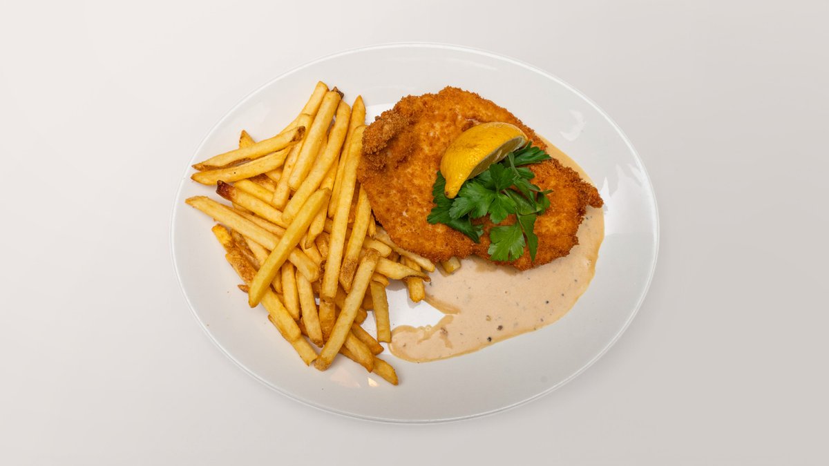 180gr. Black Angus beef in a burger with cheese, tomatoes, lettuce, mayonnaise, red onions and gherkins with French fries