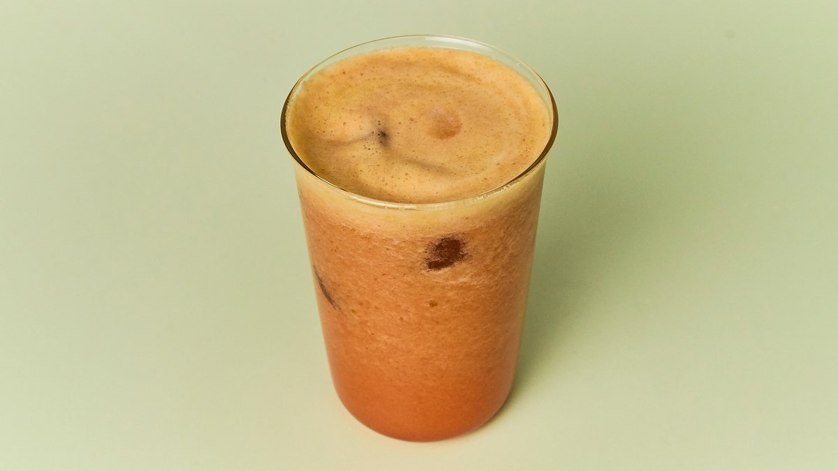 Ein gewürzter Schwarztee (Chai) mit Milch, auf Eis serviert, mit einem süßen und würzigen Geschmack.
