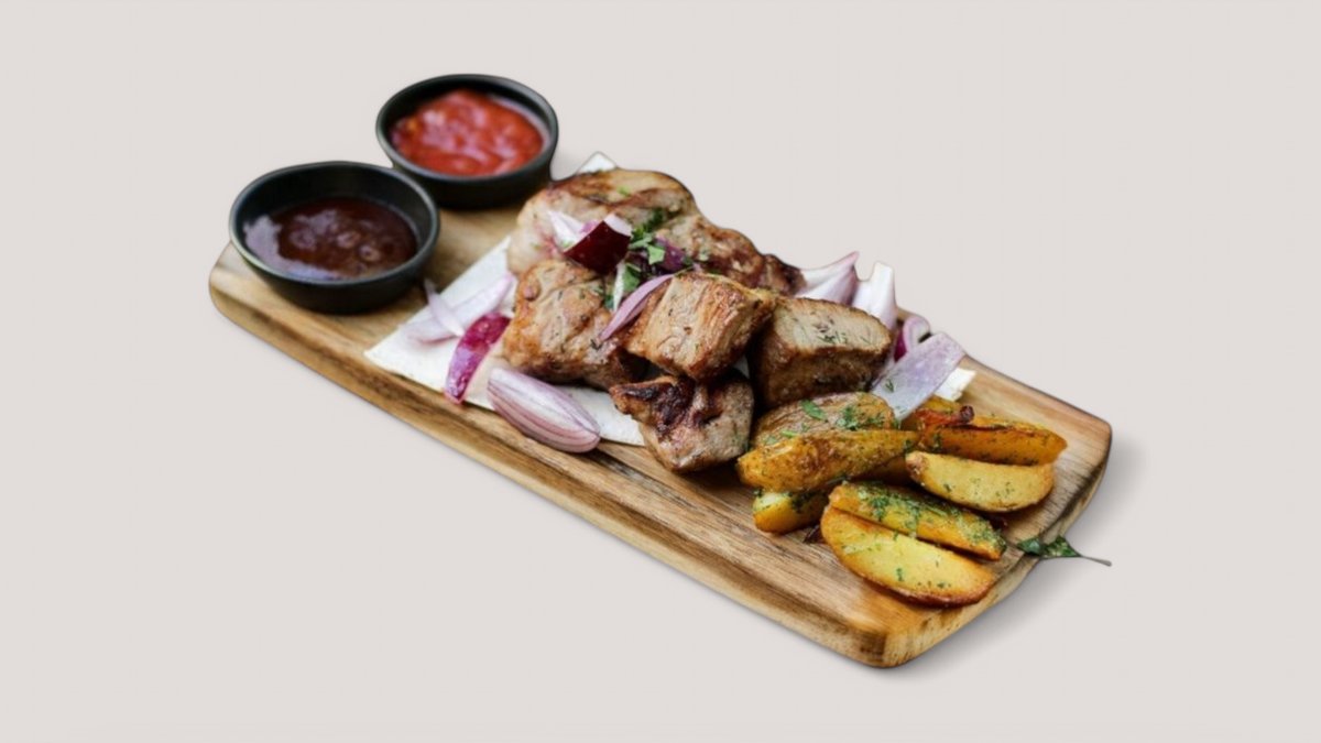 Schweinefleisch-Schaschlik mit rustikalen Kartoffeln