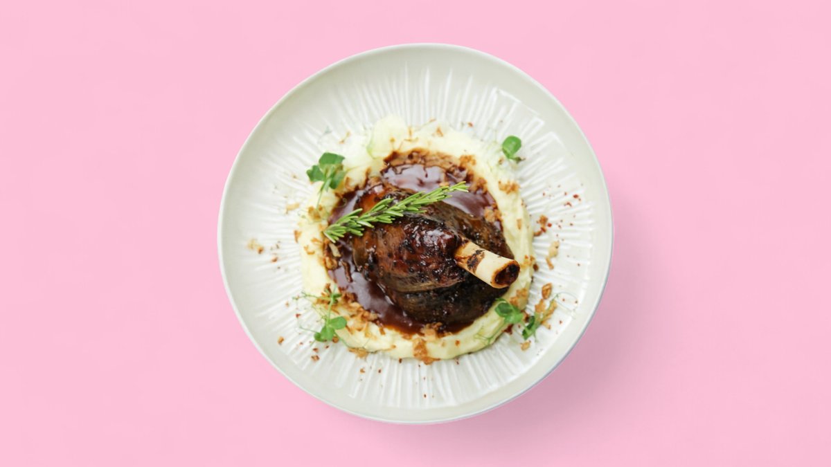 Beef Stroganoff mit KartoffelpĂĽree und Salzgurken. Nur von Montag bis Freitag von 12:00 bis 16:00