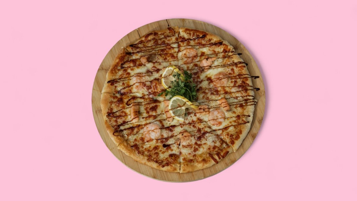 Pizza mit Garnelen, Lachs, Käse, Tomaten und Gewürze.