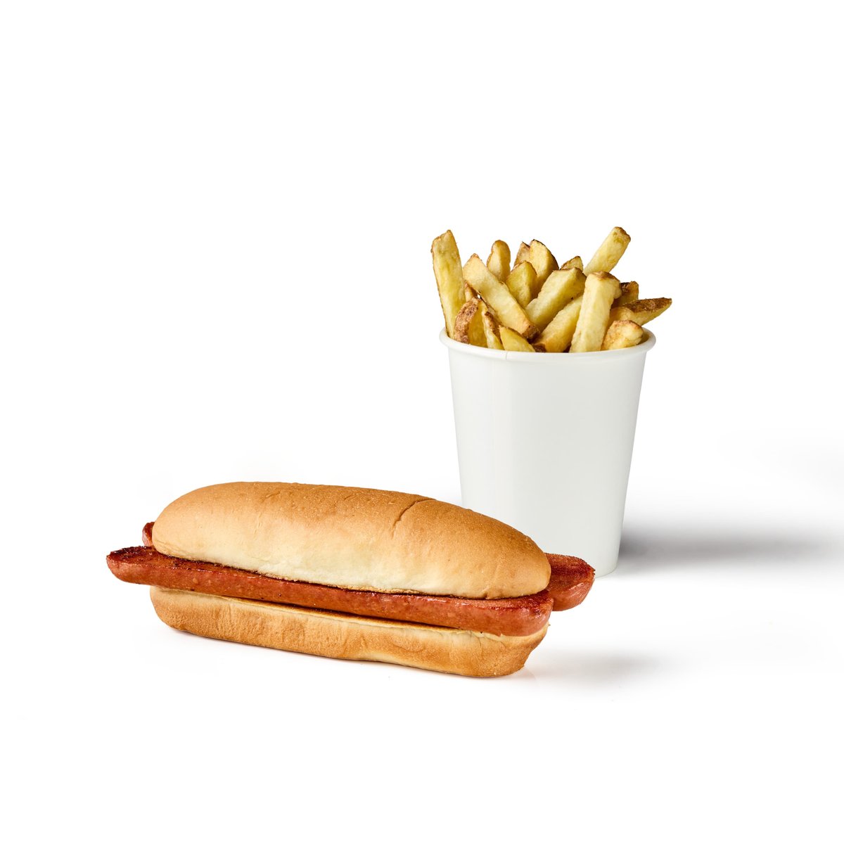 Ein leckeres Kindermenü mit einem saftigen kleinen HotDog und Mini-Fries. Dazu gibt’s 3 Toppings nach Wahl.