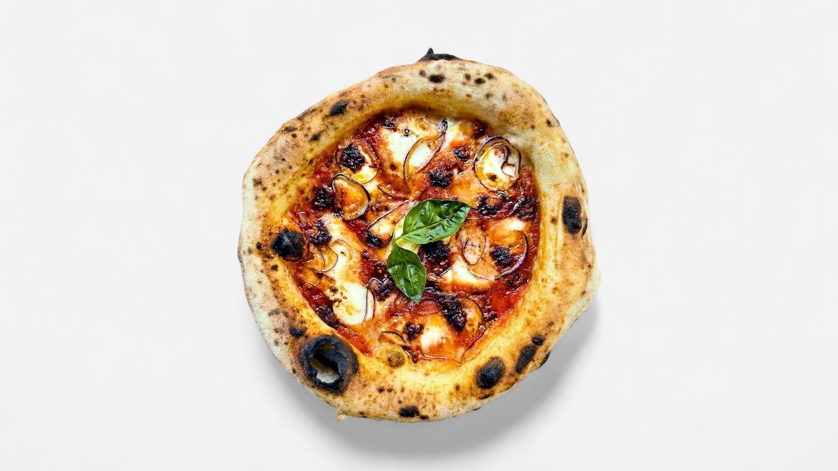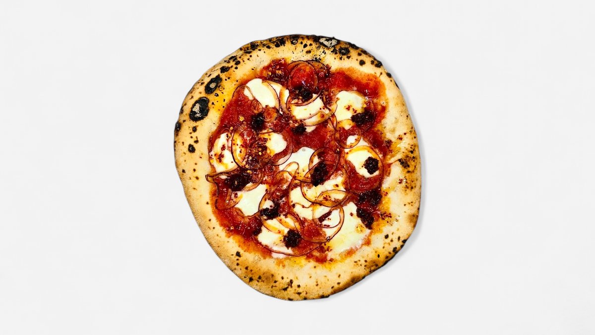 mit San Marzano D.O.P Tomatensoße, Büffelmozzarella, 'Nduja, karamellisierten scharfen Zwiebeln und Chili-Honig