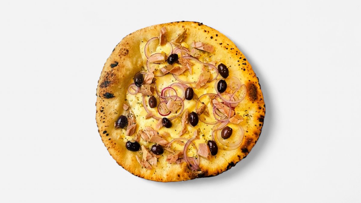 mit Mozzarella Fior di Latte, Thunfisch, Oliven, roten Zwiebeln und Oregano
