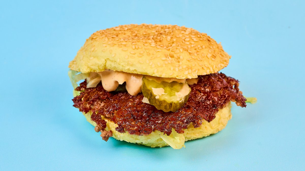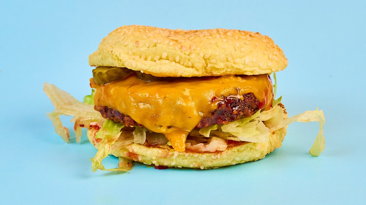 vegan patty, lettuce, onions, cucumbers, ketchup and mustard