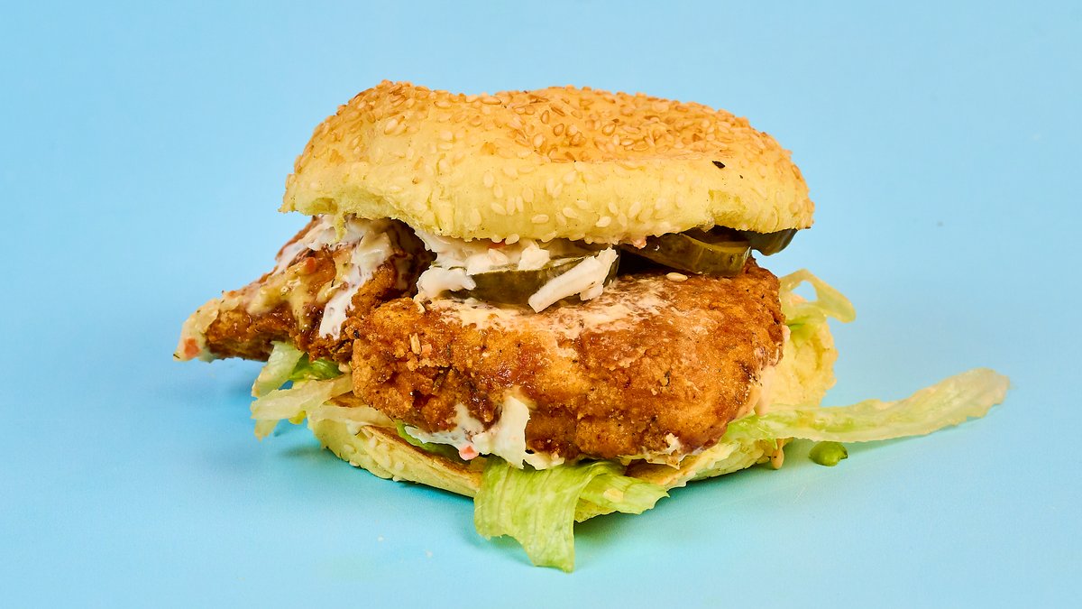 fried chicken, double cheese, pickles, colorful coleslaw and homemade ranch sauce