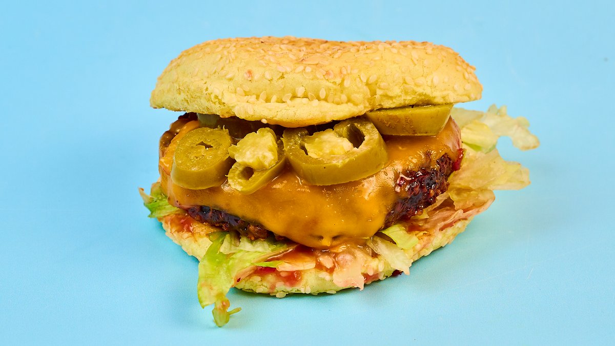 vegan patty, lettuce, onions, jalapeños, ketchup and mustard