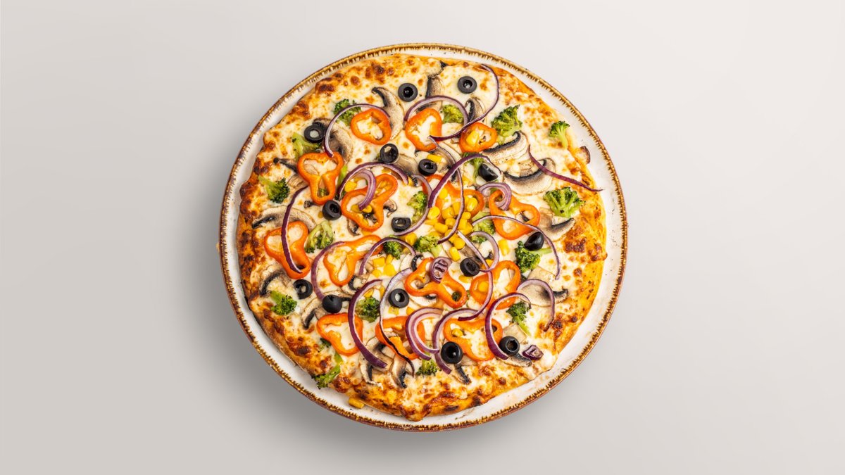 Mit Champignons, Paprika, Zwiebeln, Oliven, Broccoli und Mais. Wird mit Käse und Tomatensauce zubereitet.