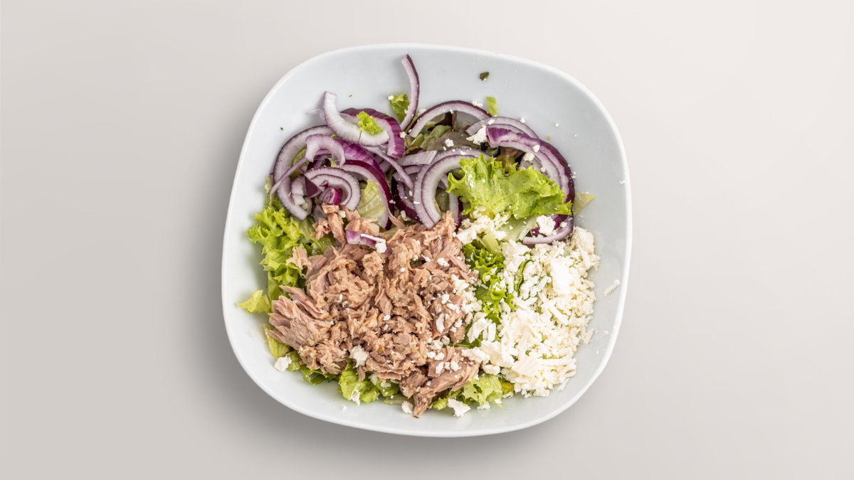 Salat mit Zwiebeln, Thunfisch und Weichkäse.