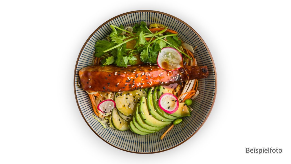 crispy chicken, mixed salad, avocado, mango, corn, bell pepper, edamame, cucumber, teriyaki sauce, cocktail sauce, sesame and fragrant rice