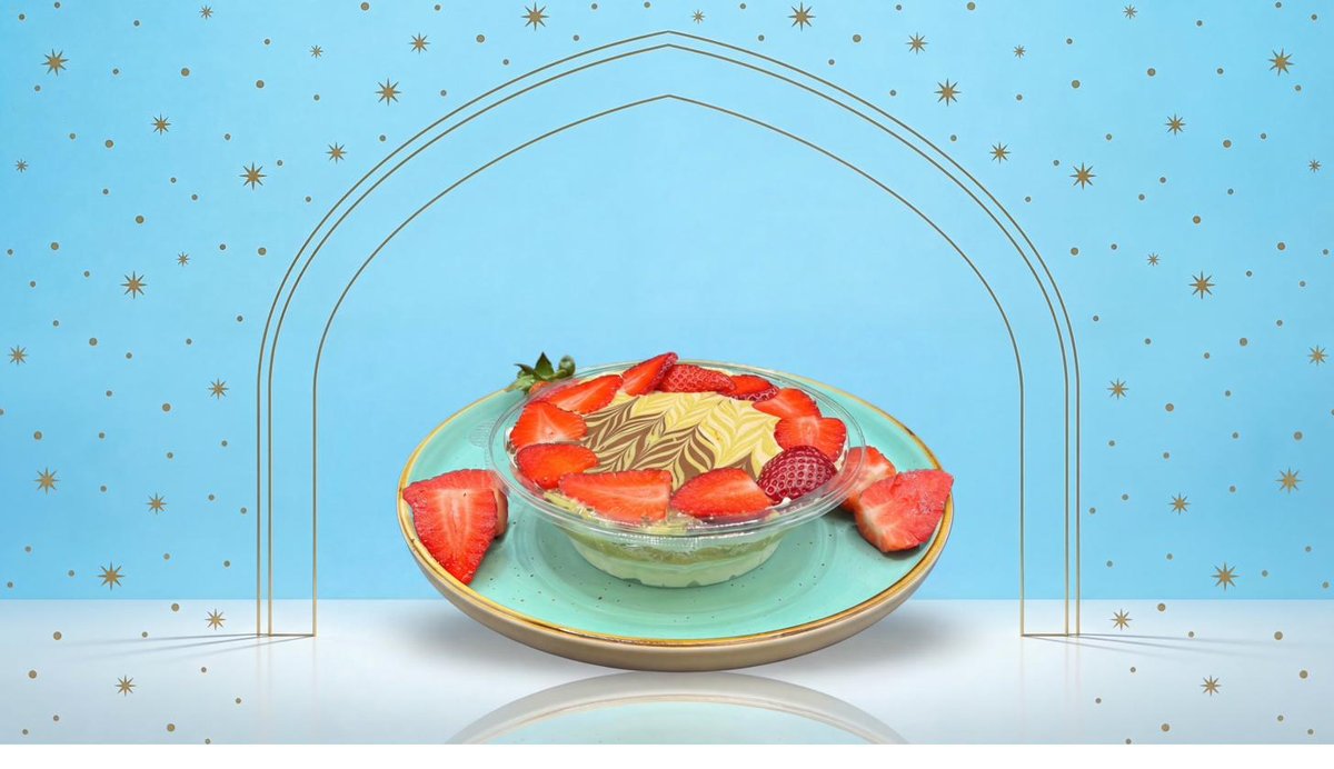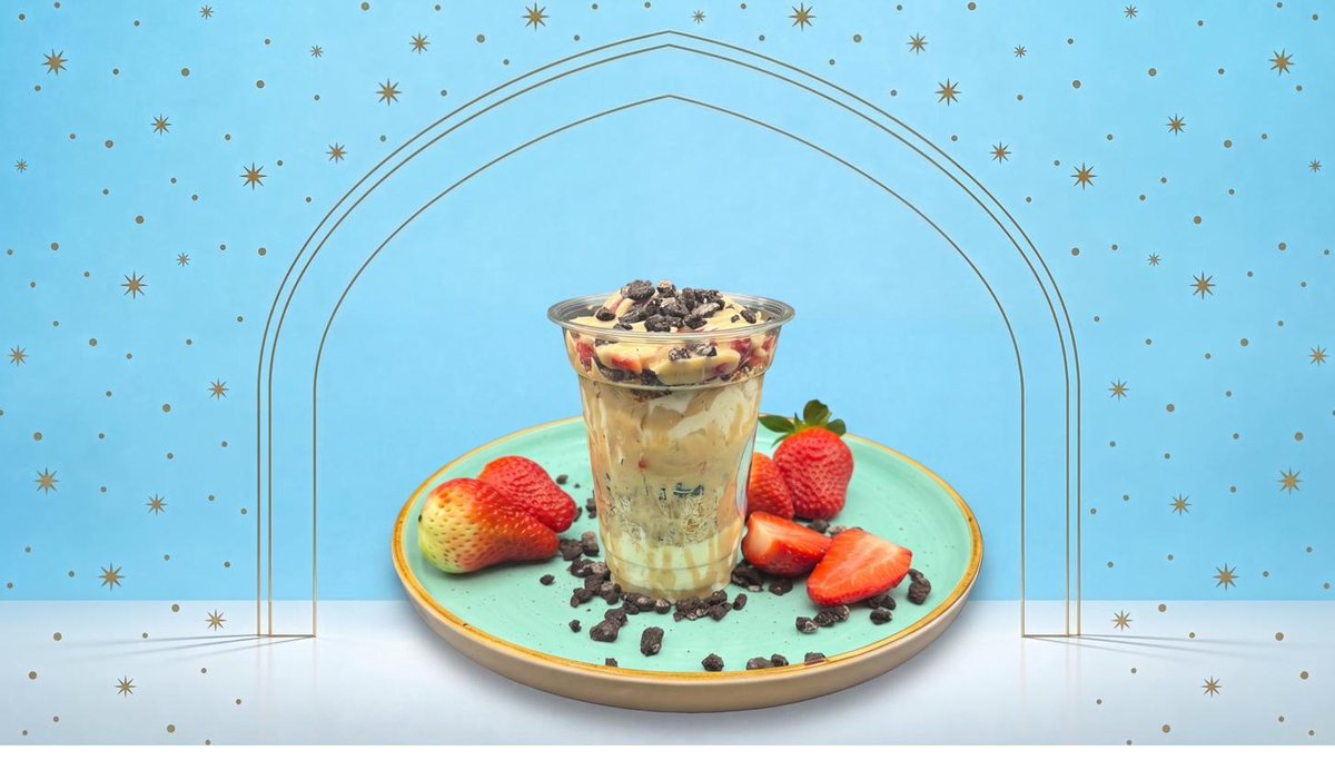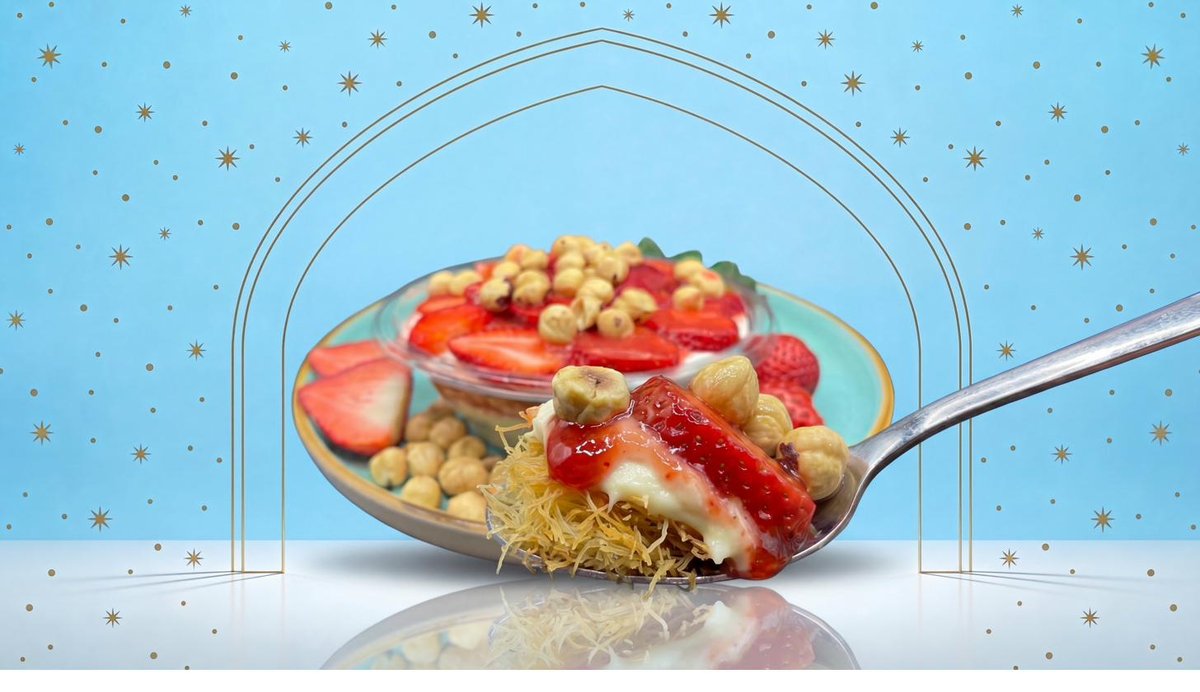 mit Kunafa, Mascarpone , Orea Krümel , frischen Erdbeeren und Buenosoße