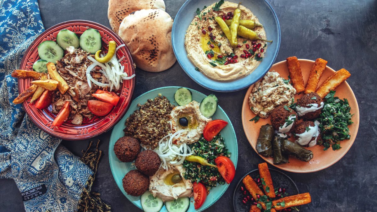 alle Tellergerichte werden mit Hummus, Tabouleh, Auberginenpaste, mediterranem Falafel, Zwiebeln, Tomaten, Gurken, Pepperoni und Soße zubereitet und mit hausgemachtem Brot serviert (auf Wunsch mit Topping & Extra Soße bestellbar)
