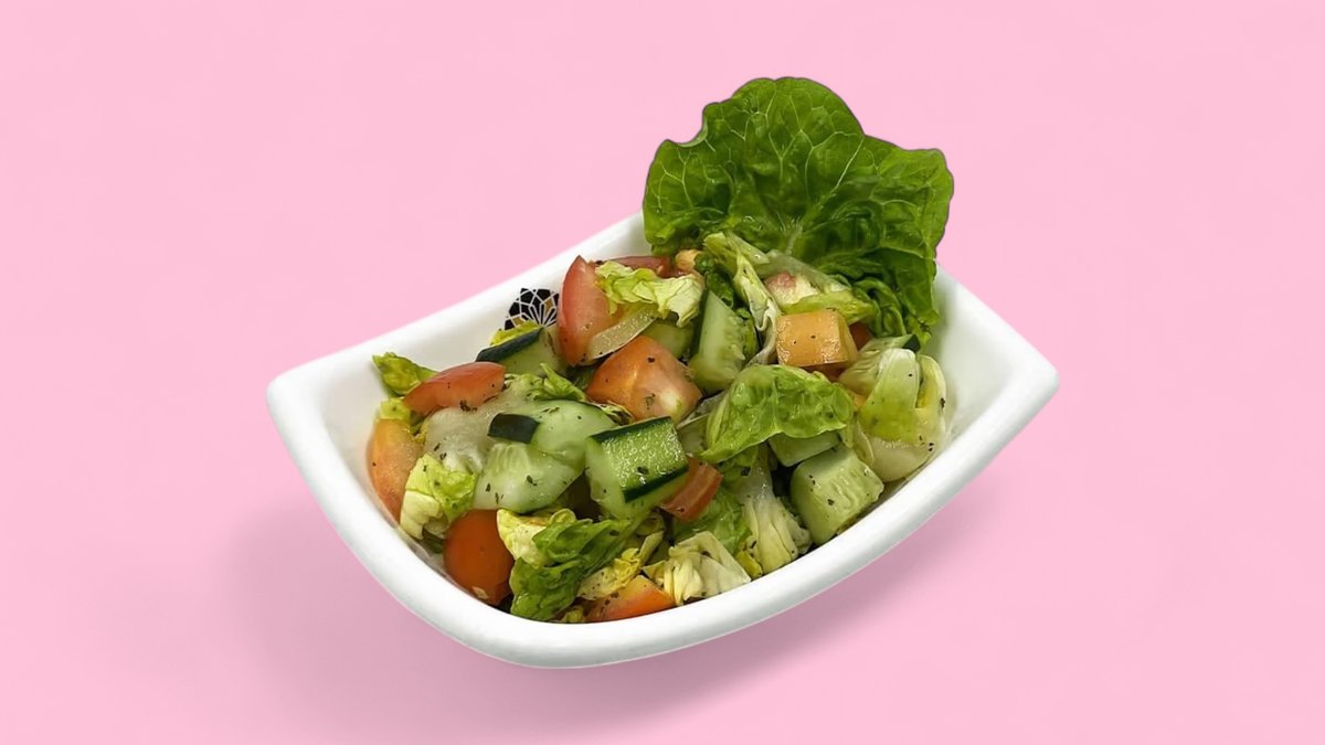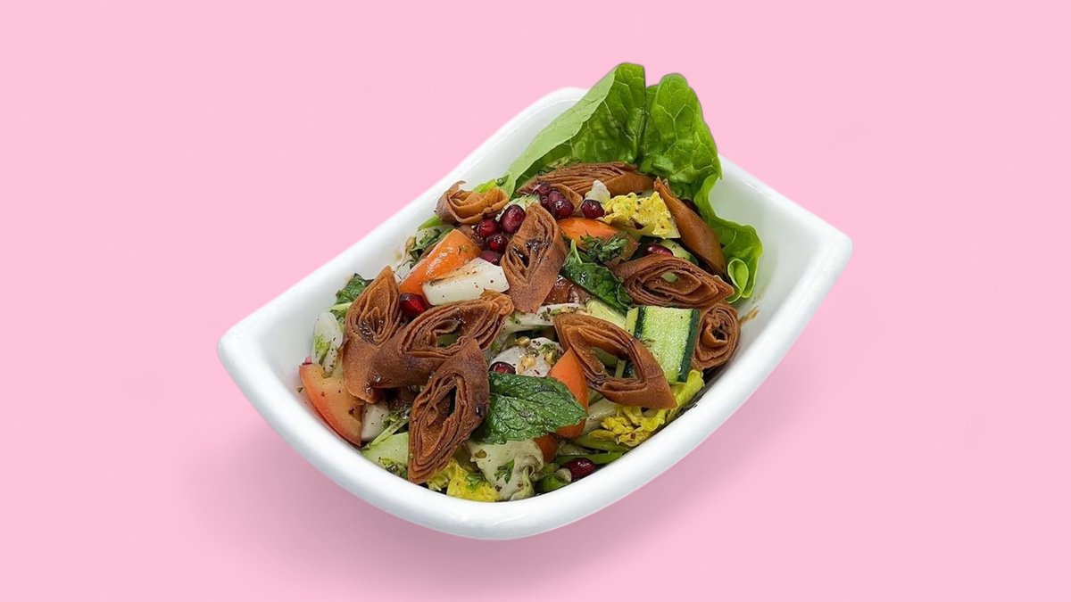 A traditional salad of iceberg lettuce, tomatoes, cucumbers, parsley, and crispy fried bread, seasoned with lemon juice, sumac, olive oil, and a hint of pomegranate dip. Fresh, spicy, and typically Levantine.