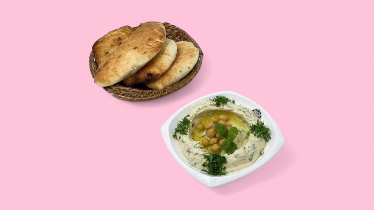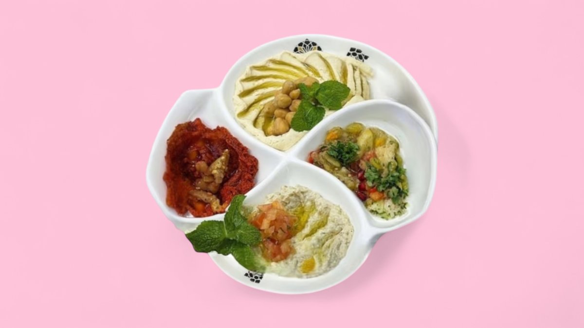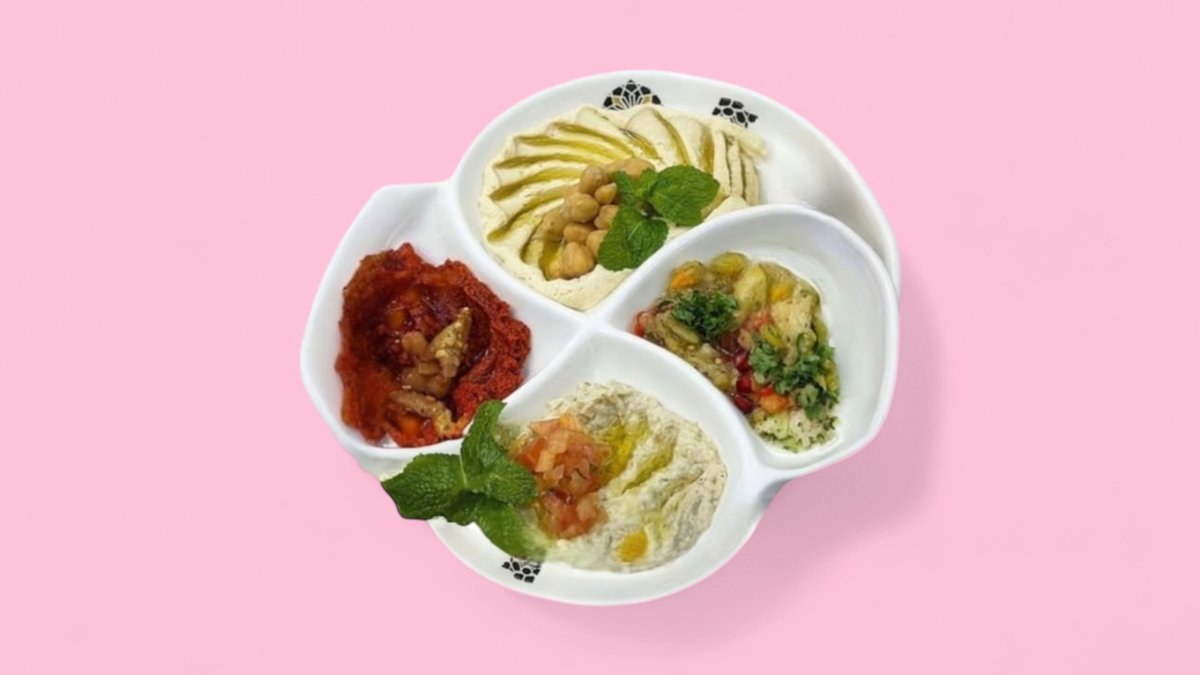 Creamy hummus, Beirut-style hummus, fattoush, and baba ghanoush – a colorful and delicious vegan selection served with Hadramaut-style bread.