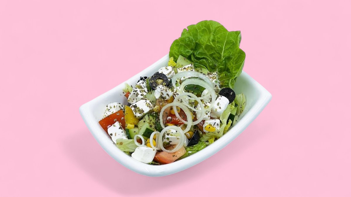 Iceberg lettuce, tomatoes, cucumbers, and colorful bell peppers – combined with mild cheese and seasoned with mint, sumac, lemon juice, and olive oil. Fresh, balanced, and with a creamy note.