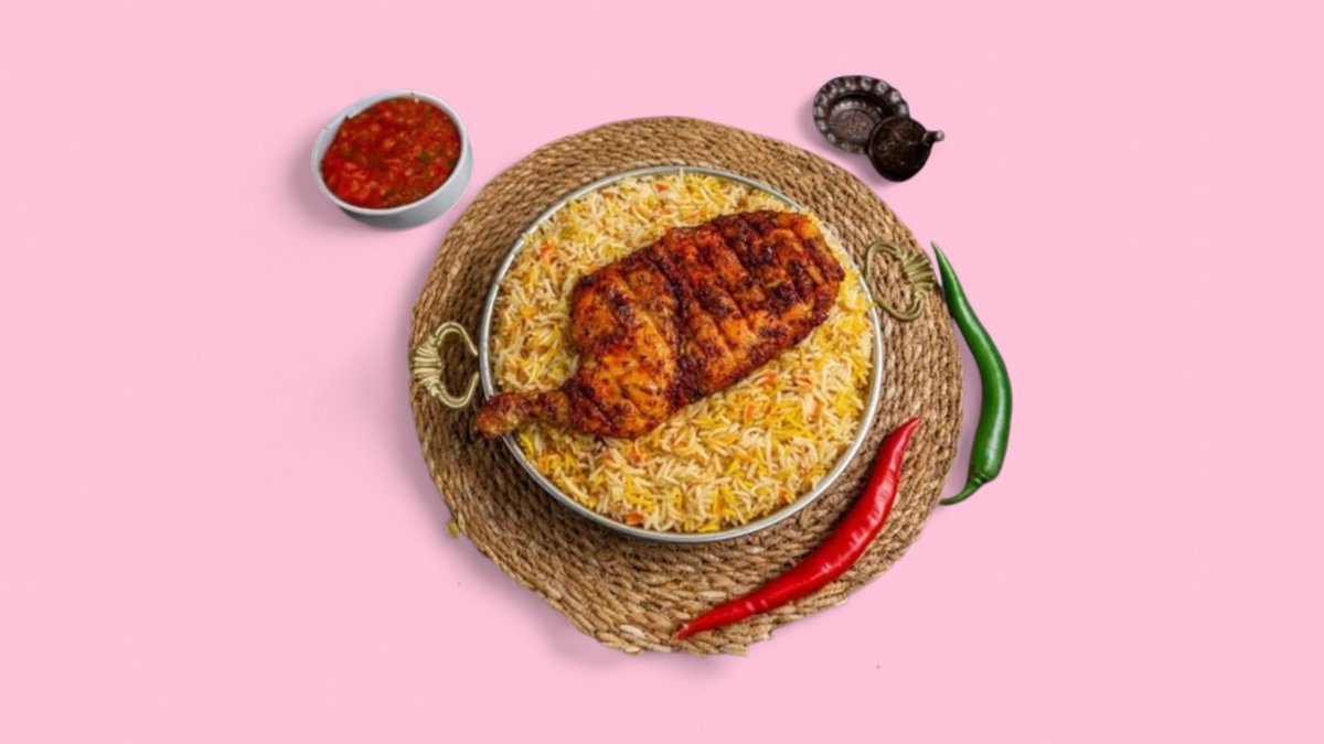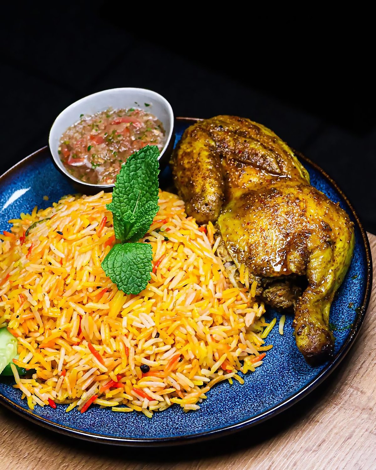 A chicken dish fit for a king: grilled over open heat until the skin is golden brown and the meat is tender. A finely balanced blend of spices adds a touch of spiciness with an oriental character. Served with golden Mandi rice – refined, intense, and balanced.