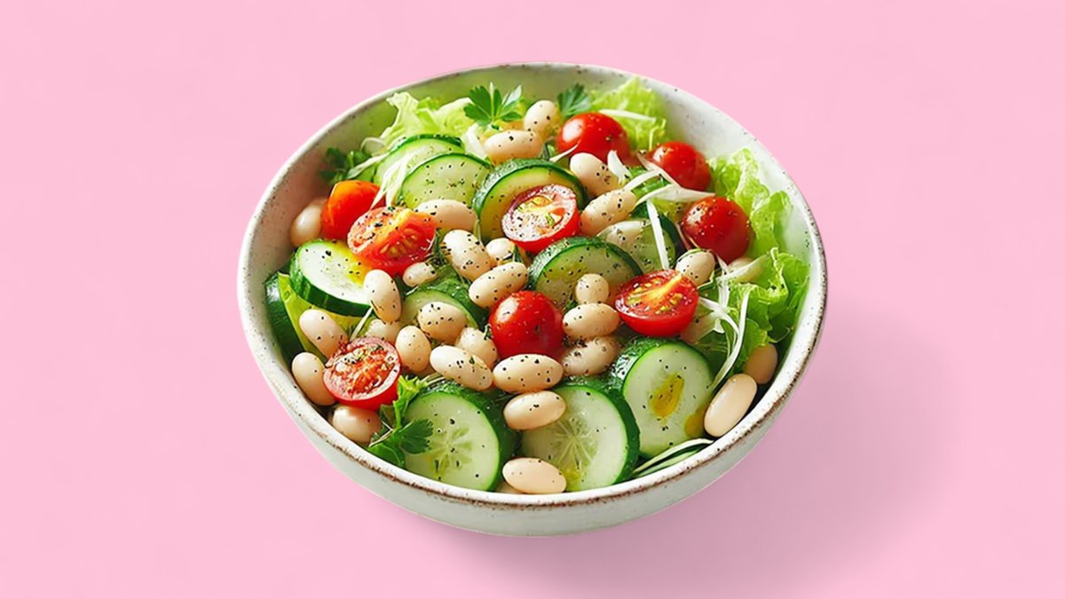 White beans with tomatoes, cucumbers, and iceberg lettuce – rounded off with mint, sumac, lemon juice, and olive oil. A protein-rich salad with a fresh bite and tangy flavor.