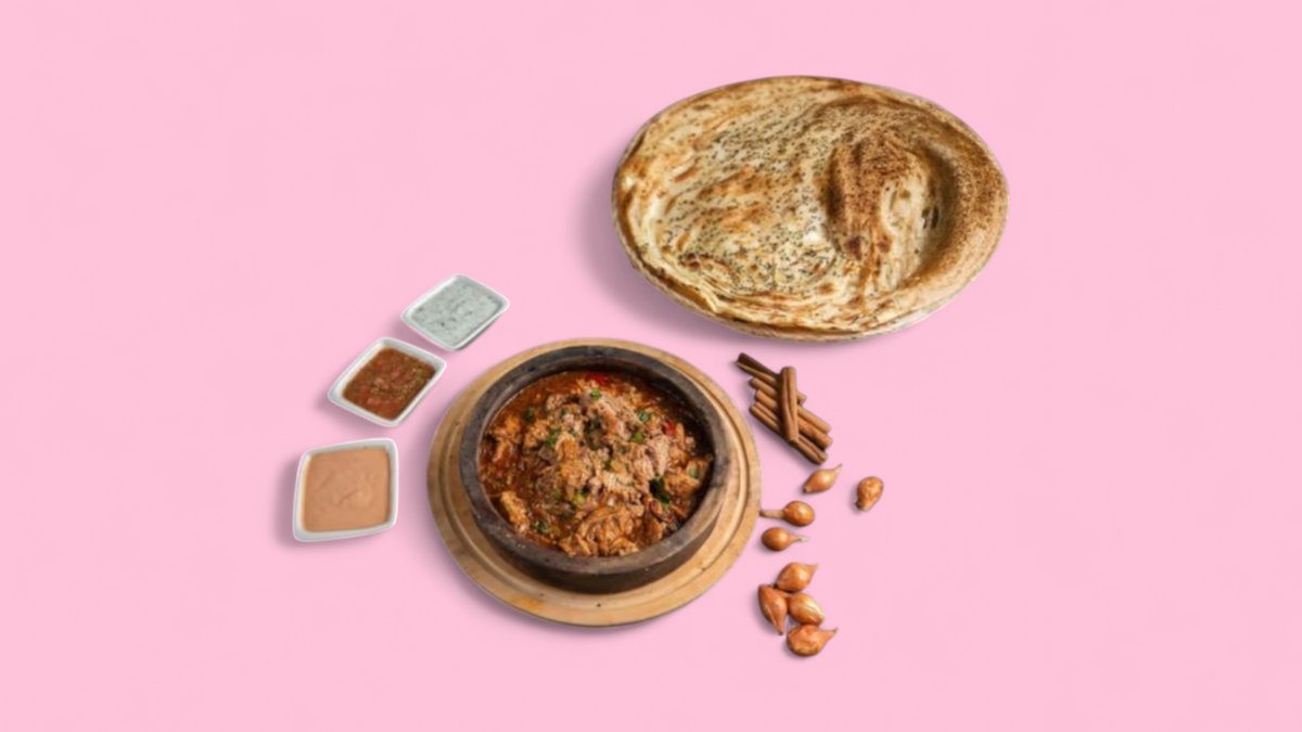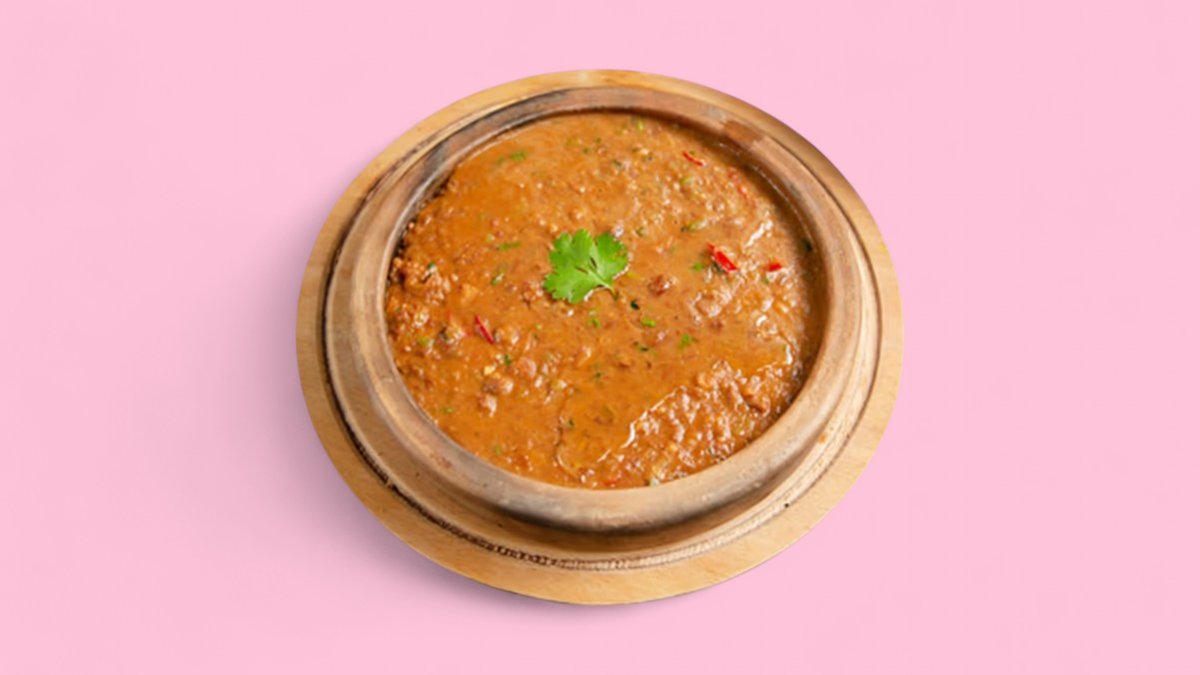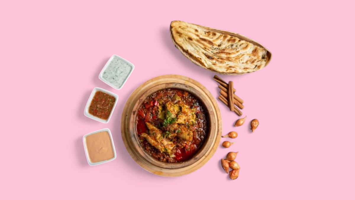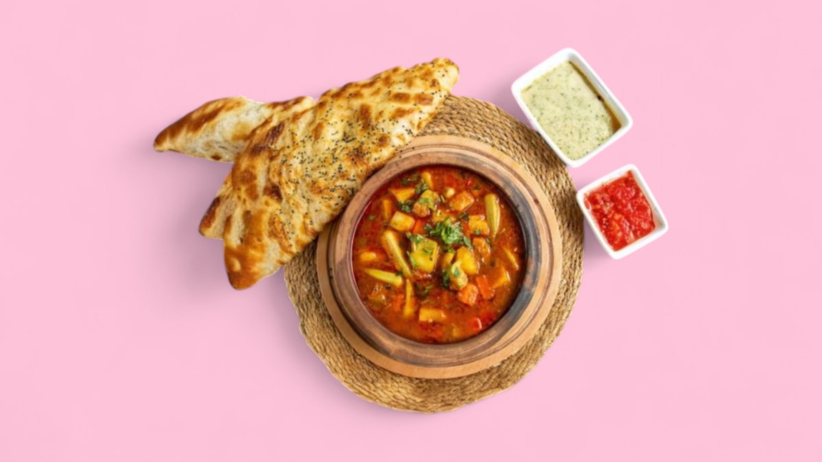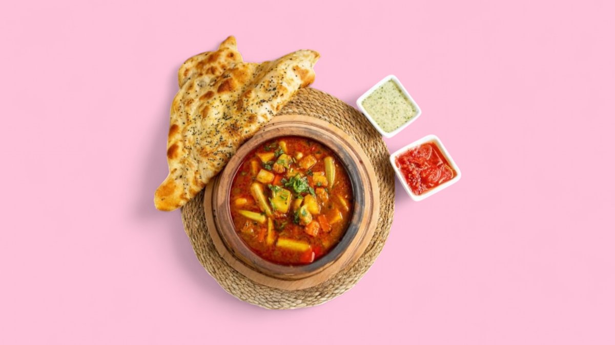 A flavorful chicken dish in a spicy tomato sauce, braised with potatoes, carrots, eggplant, and zucchini. Refined with kushna and a balanced blend of spices. Served in a clay pot, with a choice of bread or rice.