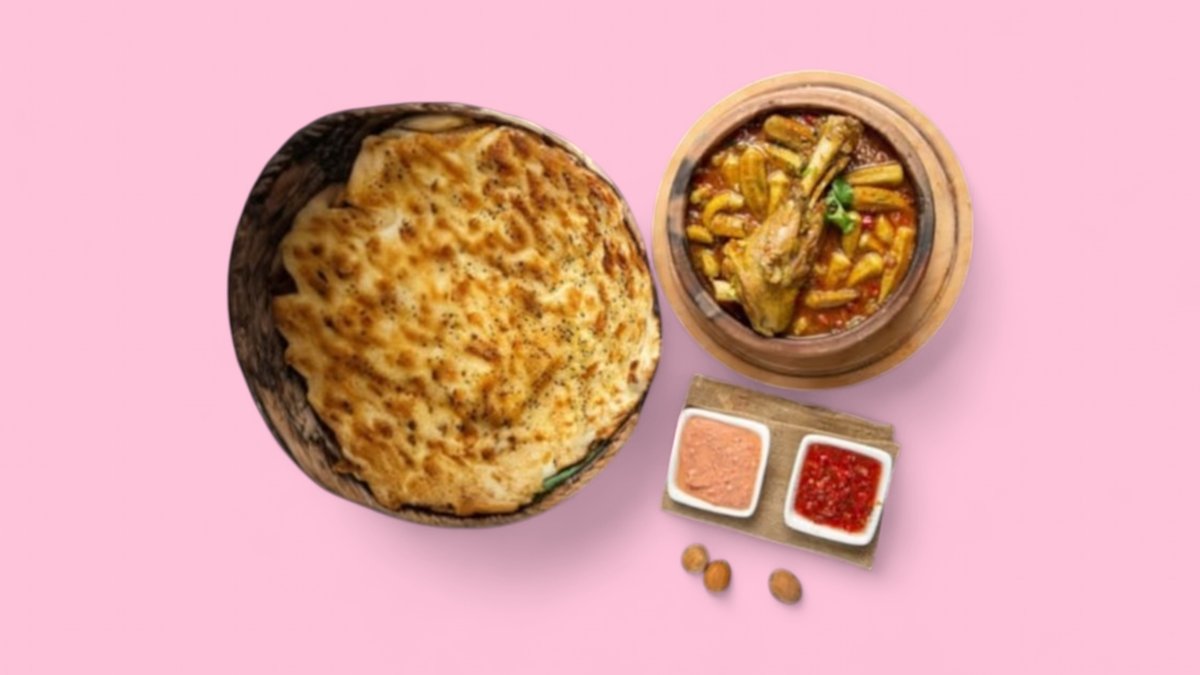 A festive dish with layered vegetables (potatoes, carrots, eggplant, zucchini, and spring onions), rice, kushna, and okra – delicately seasoned and served in a clay pot. Ideal with bread or rice.