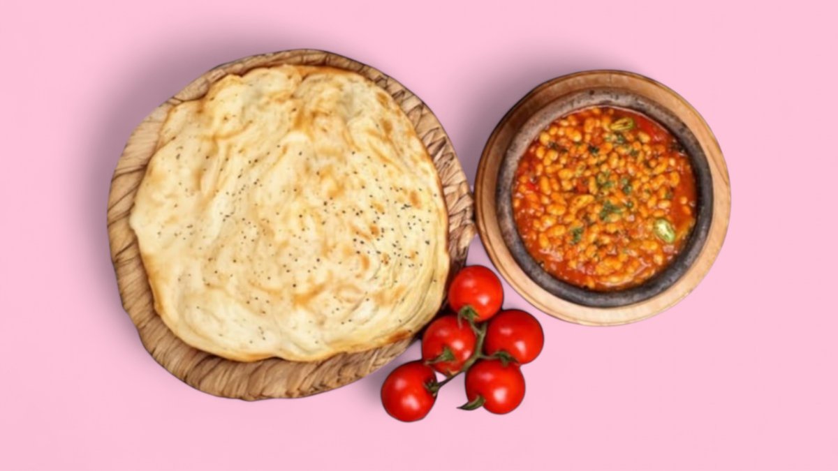 Quail beans cooked with tomatoes, onions, and kushna—no liquid, but full of rich flavor. Ideal with bread.