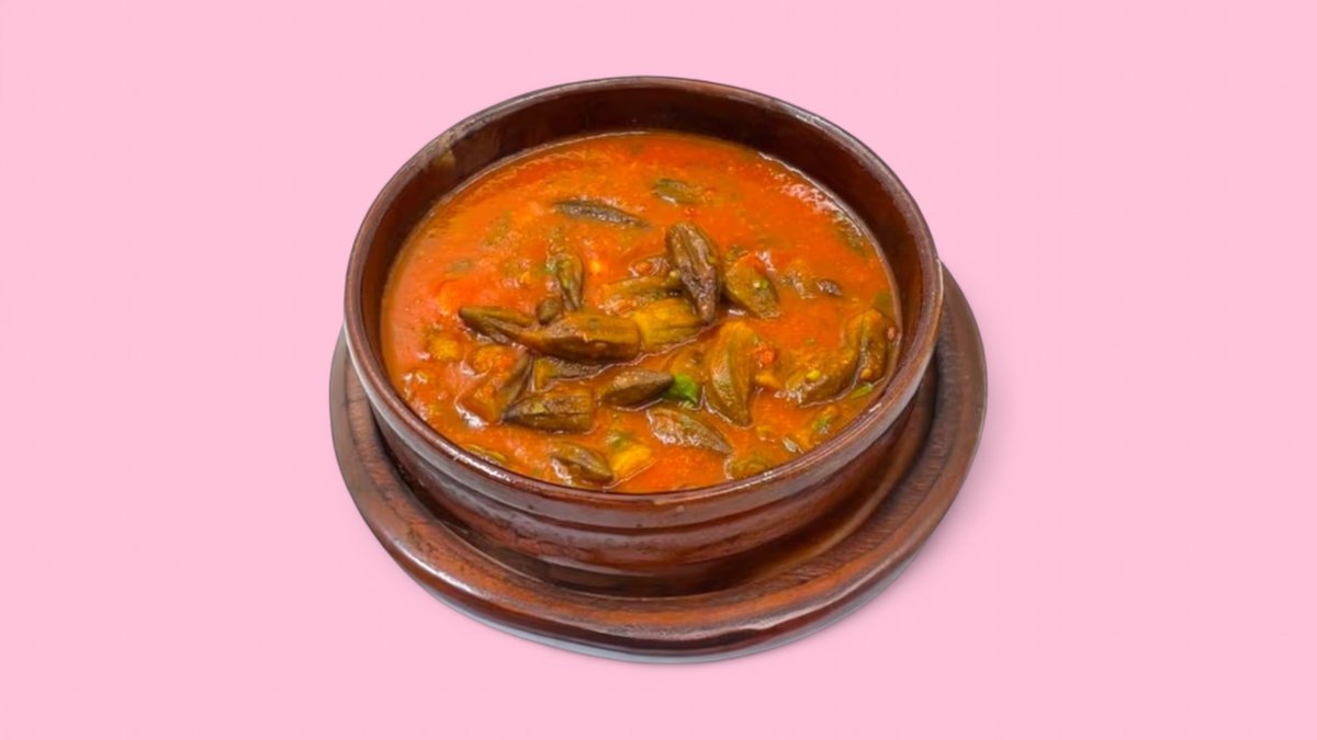 Tender okra in a flavorful, liquid sauce made with tomatoes, onions, chili peppers, and fresh cilantro – gently cooked and served in a clay pot. Served with bread or rice.
