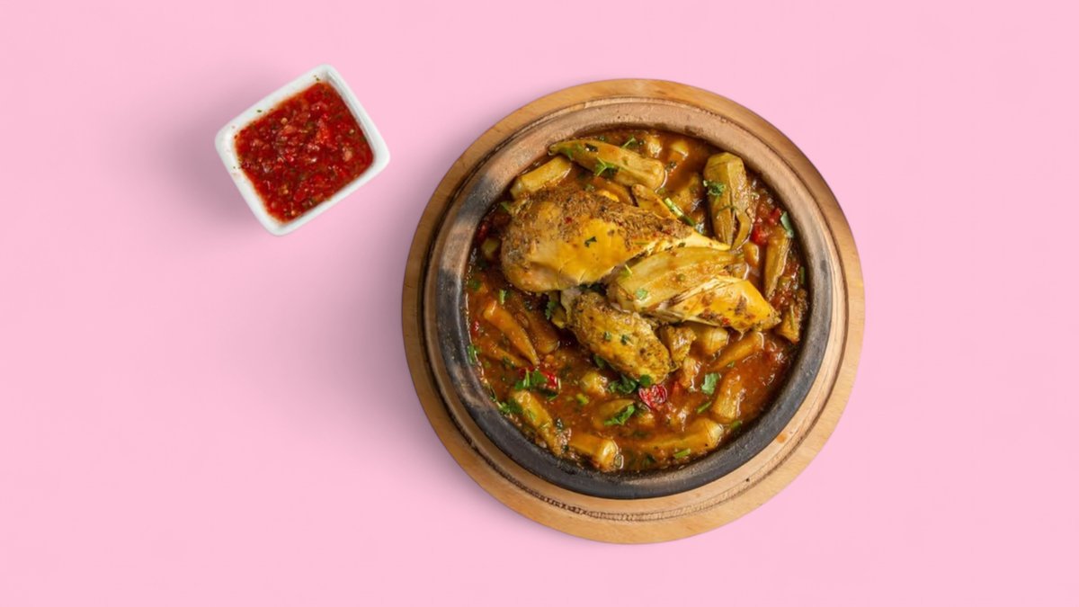 Tender okra with chicken, cooked in a rich sauce of tomatoes, onions, peppers, and herbs. Served in a clay pot with bread or rice.
