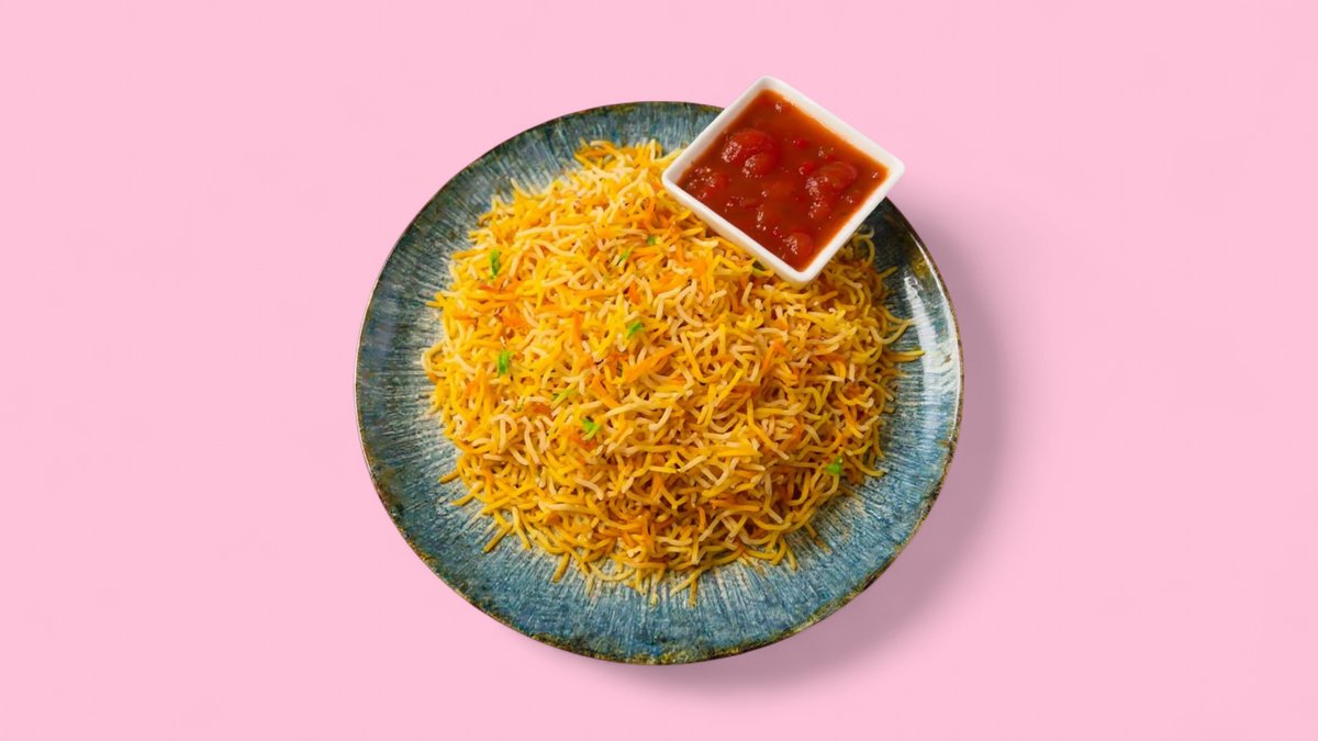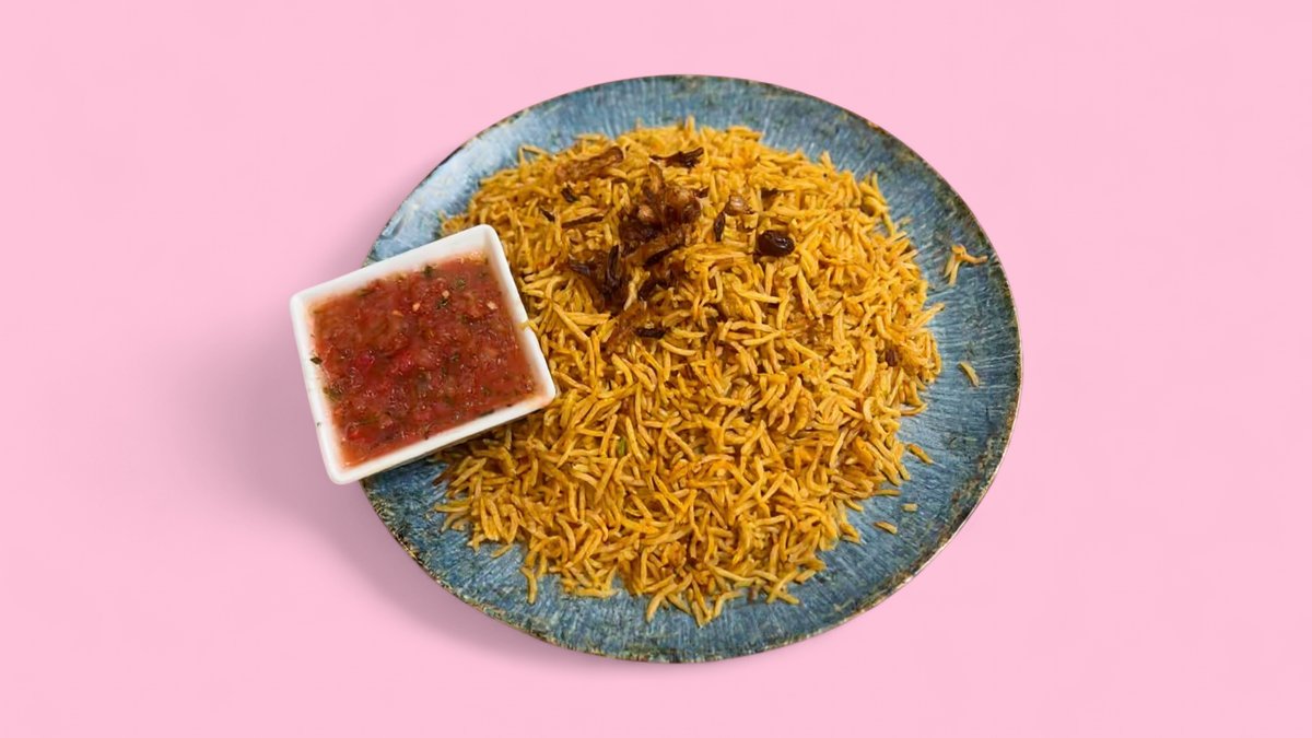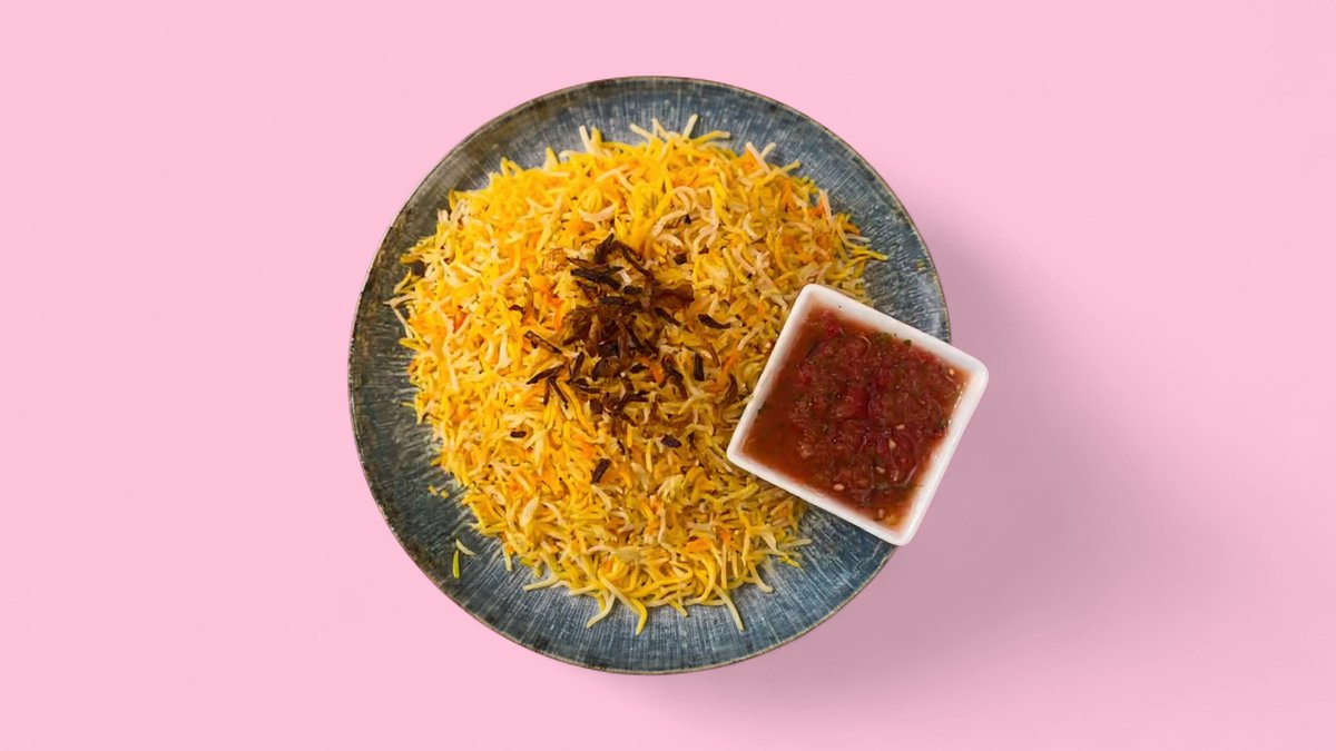 Sheba-style rice – layered and slow-cooked with yogurt, fried onions, garlic, and a signature blend of cardamom, cumin, cinnamon, and cloves – full of flavor and unique.