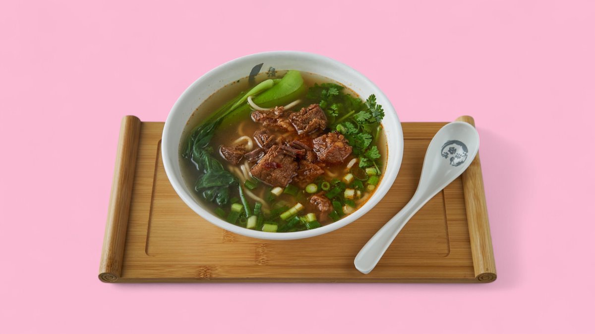 Classic Chinese noodle soup with braised tofu, shiitake mushrooms and spring onions