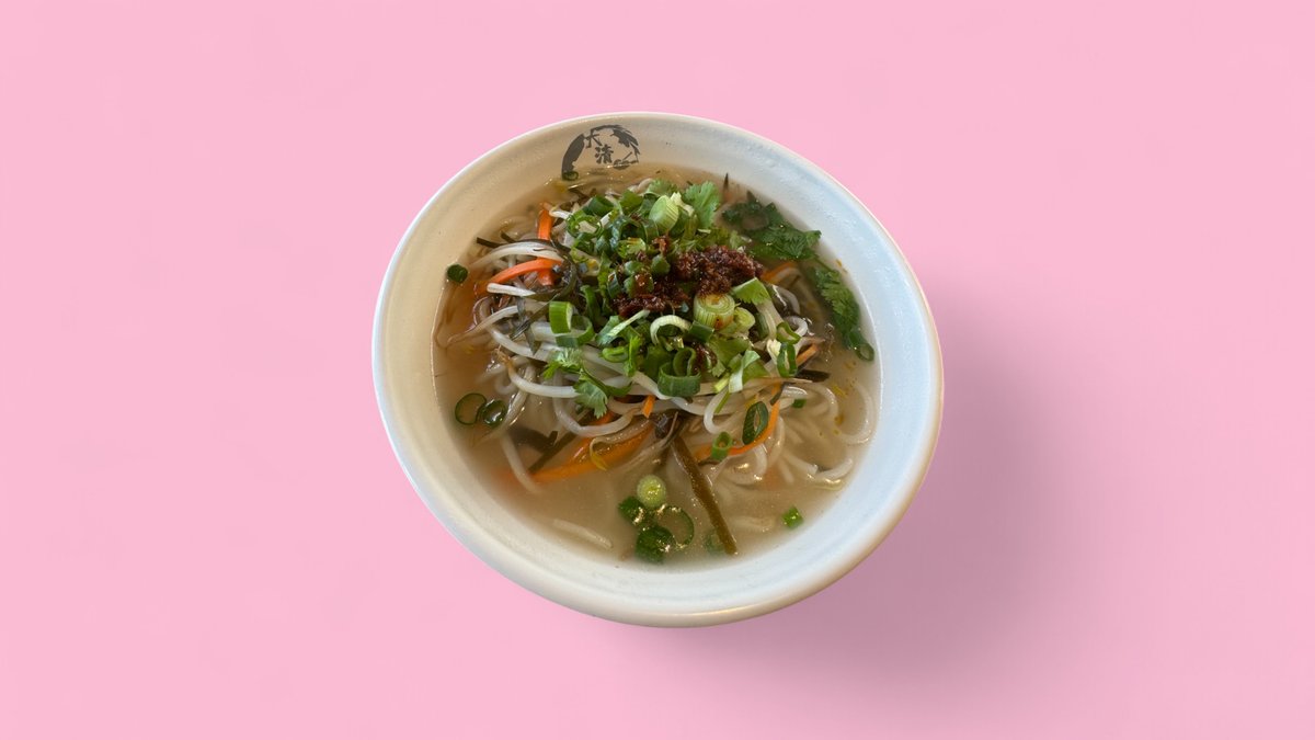 Traditional Chinese rice noodle soup with a spicy, hot aroma with bean sprouts, seaweed, smoked tofu, coriander and leek