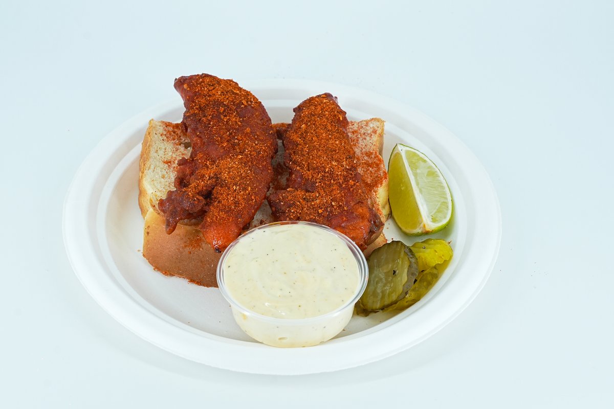 unsere legendäre nashville hot chicken knusprig frittiertes hähnchen auf geröstetem toastbrot, verfeinert mit hausgemachter soße, würzigen pickles, knackigem coleslaw-salat und einer feurigen schärfe, die richtig reinhaut. eine perfekte kombination aus crunch, würze und geschmack.(Halal)