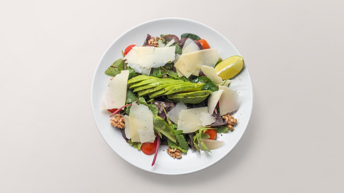 mit Blattsalat, Kirschtomaten, Avocado, Walnüssen, italienischem Hartkäse und Hausdressing