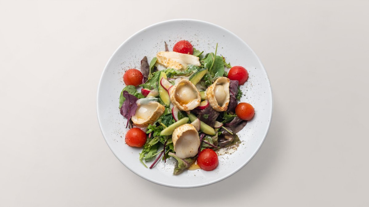 mit Blattsalat, Kirschtomaten, gebratenem Ziegenkäse, Datteln, Gurken, Radieschen, Honig und Hausdressing