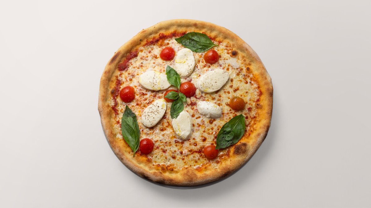 Steinofenpizza mit PestosoĂźe, frischem Mozzarella, frischen Kirschtomaten und Rucola