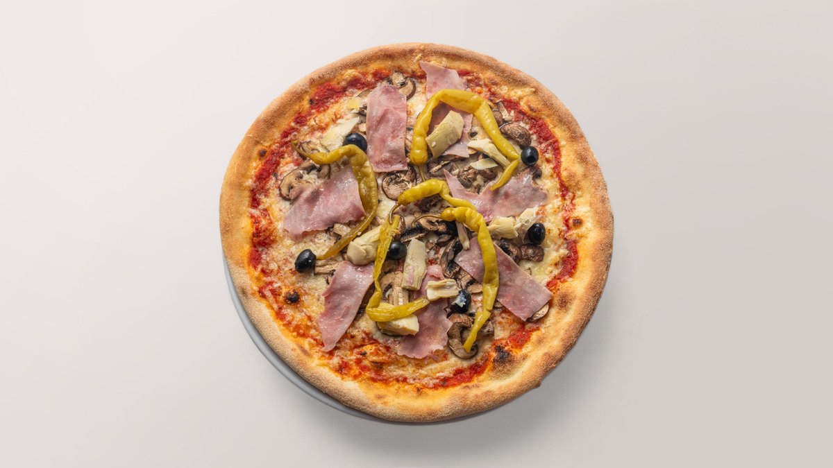 mit TomatensoĂźe, Edamer, gekochtem Schinken, Champignons, Artischocken, Oliven und Pepperoni
