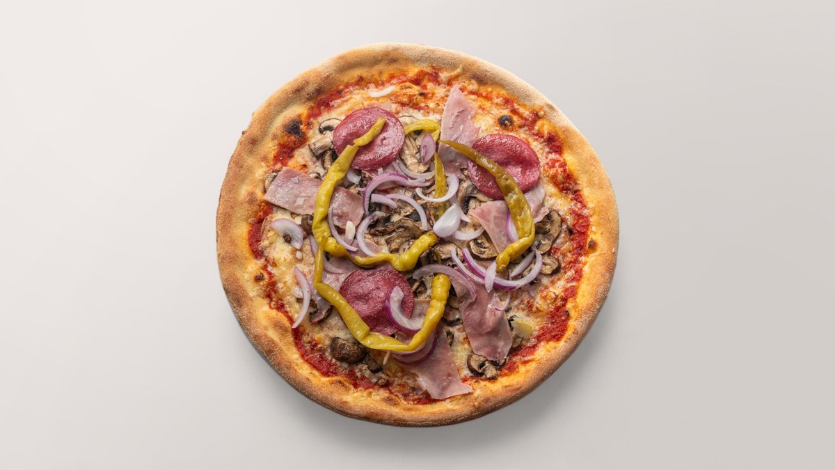 mit TomatensoĂźe, Edamer, gekochtem Schinken, Champignons, Salami, Pepperoni und roten Zwiebeln